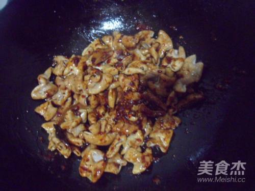 放入肥肠、料酒翻炒