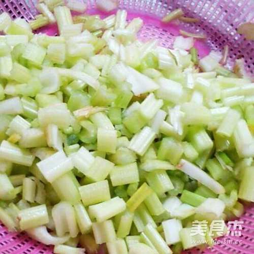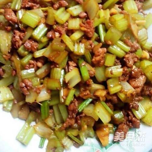 把肉切小块、锅里热油放入葱花出香味、放肉、变白后放生抽、翻炒几下放芹菜、依次放入糖、盐、鸡精(最好炒的时候尝一尝)
