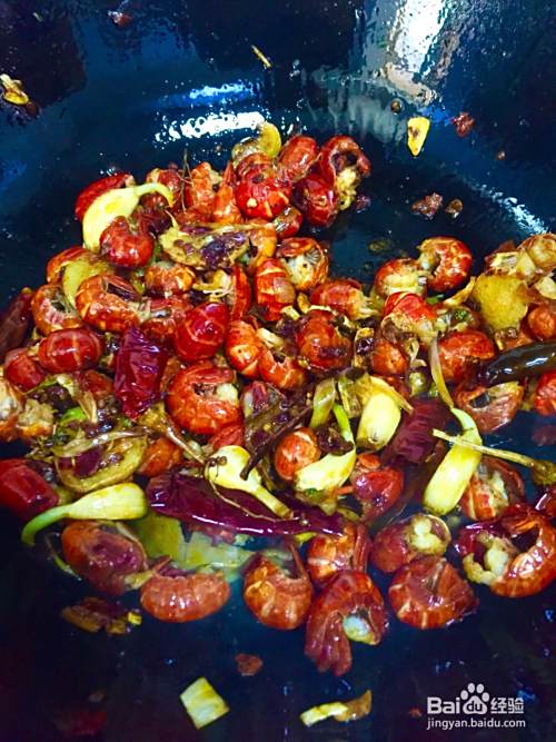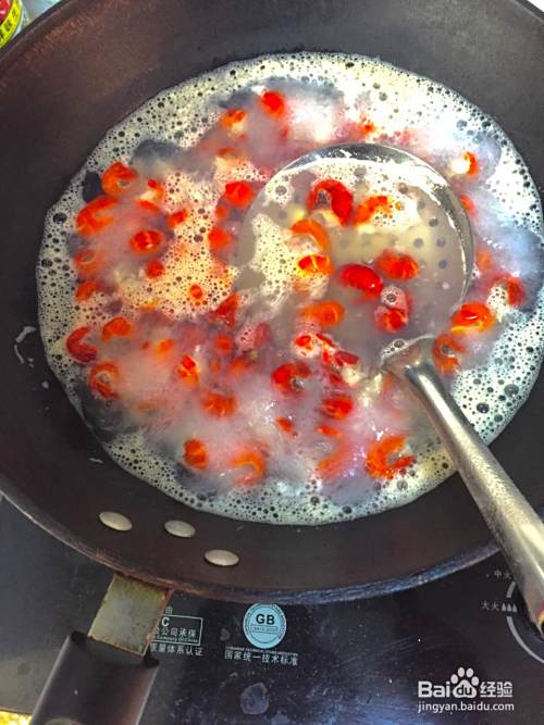 加入虾尾和一些料酒,快速翻炒半分钟。
