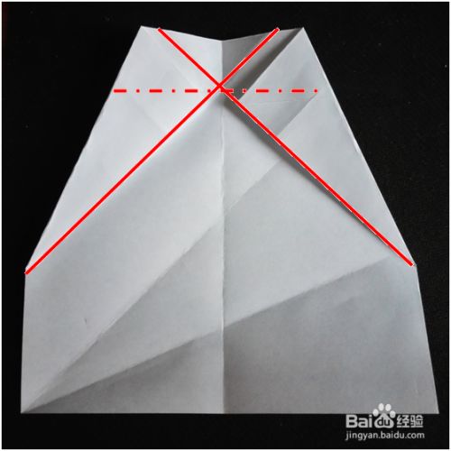 红色实线标记的是两条折痕的中心点,过那个中心点,把上面的部分向下折,得到一条横向的折痕。