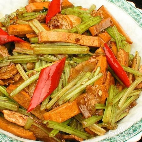 炒至7-8层熟的时候,倒入芹菜、香干、菜椒、盐等相关的着料,小炒5-6分钟即可。