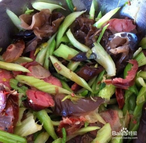 下相关的配菜:香肠、黑木耳、菜椒、相关的着料等,进行翻炒,3-4分钟即可。