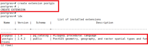 如下所示,执行成功后会提示CREATE EXTENSION,然后再使用\dx命令查看