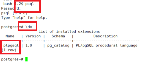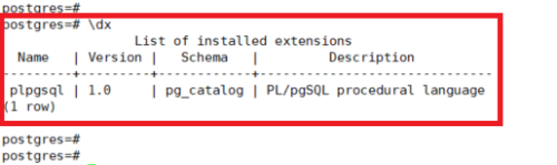 输入密码,然后使用命令\dx来查看当前系统上已经安装的插件。可以看到默认情况下只有一个plpgsql插件。