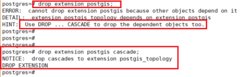 结果如下图所示,从图中看到第一次删除的时候出错了,提示有别的对象依赖于这个插件,因此不能直接删除。然后给出提示hint,说使用最后带cascade的命令格式来使用,因此我们就是用命令: