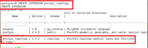 可以看到插件列表里确实多了一个postgis插件。说明我们的插件已经安装成功了。我们再尝试安装postgis关联的另外一个插件postgis_topology,命令是:
