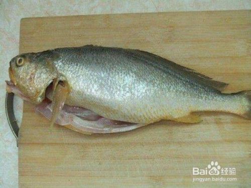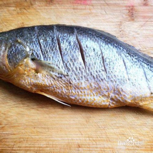 将黄鱼去鱼鳞片、去内脏、去鱼鳃,洗干净。正反划上几刀,放入盘中。