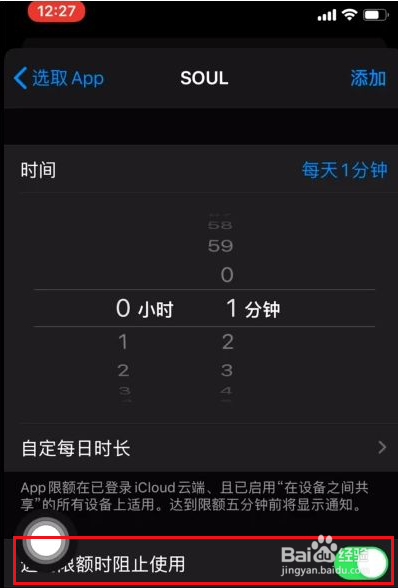我们设置一个非常短的限额时间,这里最短只能设置一分钟;当每天的时间达到一分钟以后就会出现这种界面,你需要输入之前设置的密码才能继续使用,用这个办法也可以达到应用锁的效果。