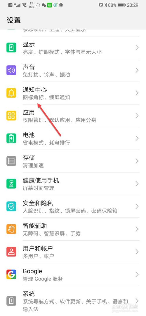 在设置界面,点击通知中心。
