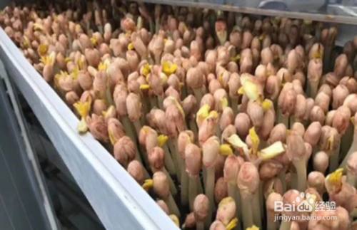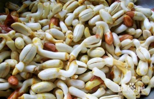 播种2-3天后,当种芽长1厘米时,将不出芽的种仁全部剔除。花生芽生长适温为18-25℃,夏季要多喷水降温,冬季要加强保温。生长期间每日淋水3-4次,以洁净的井水为宜,每次淋水量以芽苗全部淋湿,基质湿透为度。栽培期间室内应保持暗淡,不可见光,否则会使花生芽变绿,影响外观和口感。