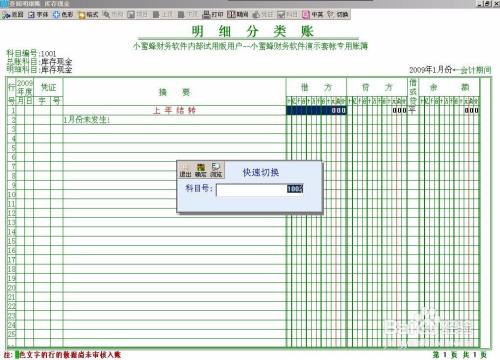 在明细账和总账中都可以迅速切换查看别的科目,只要用鼠标点一下账簿左上角的科目编号或总账科目或明细科目,系统就会弹出快速切换窗口,输入您要查看的科目代码然后确认,账页就会迅速切换。