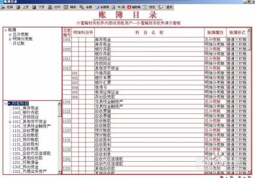 进入账簿以后,首先看到就是分类账簿总目录。这里列出的是所有科目的代码及每一个科目的账簿种类。如果想快速查找某一科目,可以先用键盘键入“+“,然后再输入科目代码或科目名称。