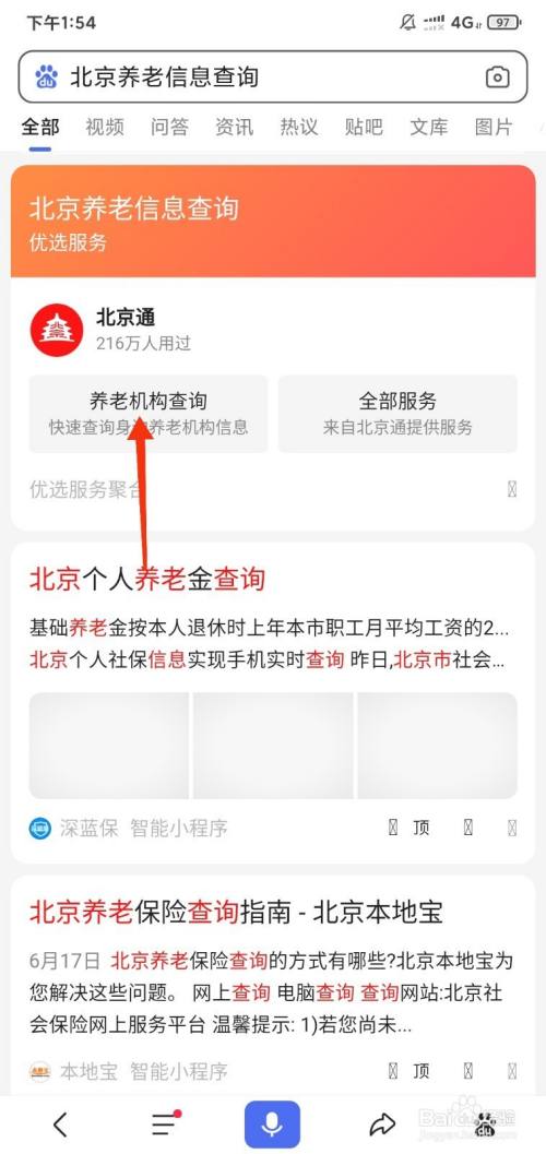 需在手机下载百度APP,在百度App搜索“养老信息查询”,点击北京通提供的养老机构查询服务,输入搜索信息或点击地区即可。该服务由“北京通”提供,权威可信。