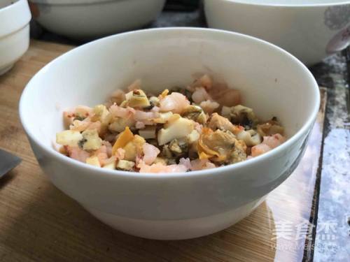 香菇切片,鲍鱼煮熟切丁,白蛤汆熟对切开,芹菜切末备用