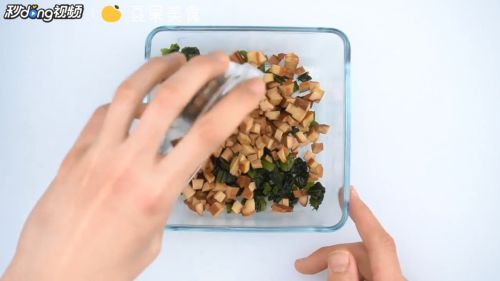 3碗中加入雪菜和豆干丁。