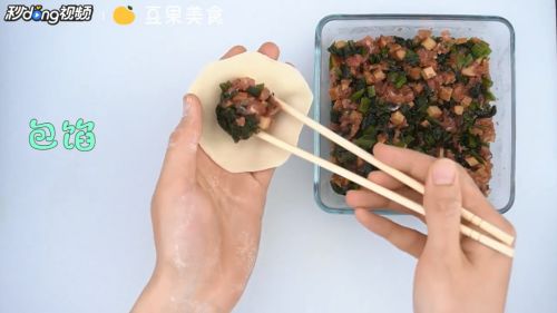 12取适量雪菜馅于面皮中央。