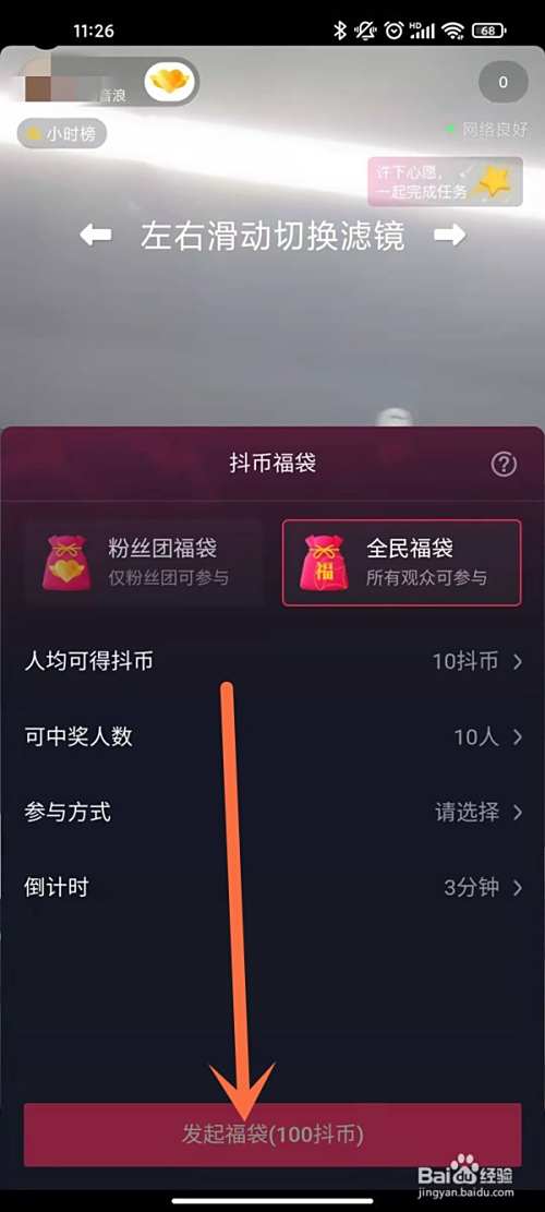 3、可以设置抖币数量,福袋个数,倒计时,参与范围和参与方式,再点击发起福袋即可。其中参与范围可选所有观众或者仅粉丝团;参与方式可选择无,或者输入口令参与。