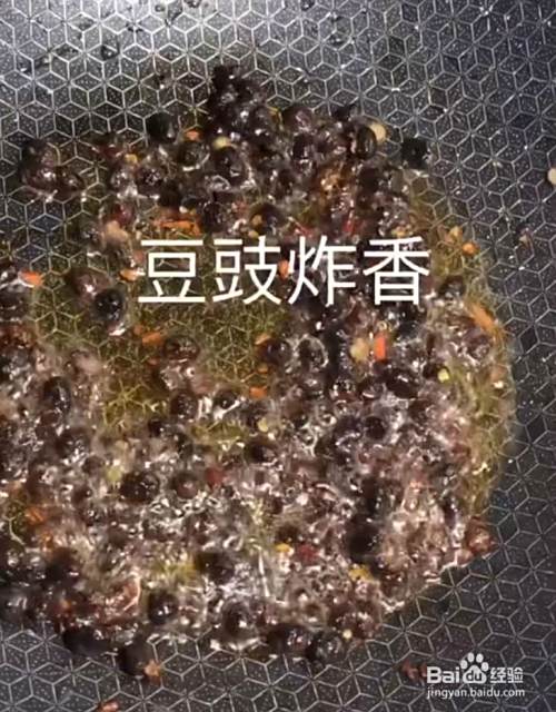 锅内烧油,放入豆豉炸香。见下图