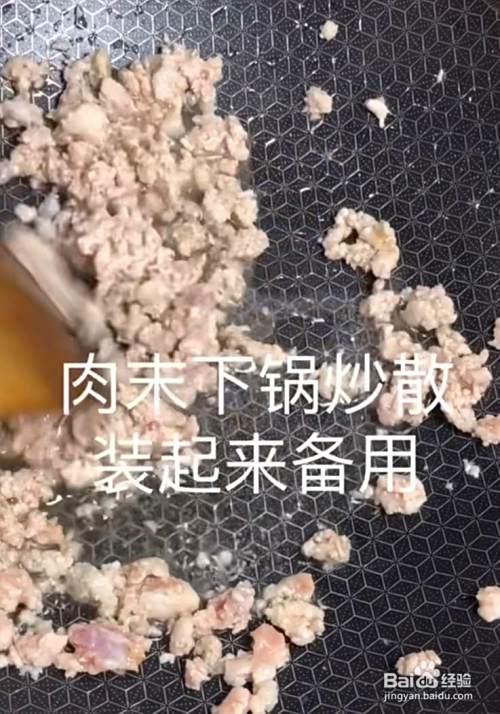 锅内烧油,放入肉末,炒散备用。见下图