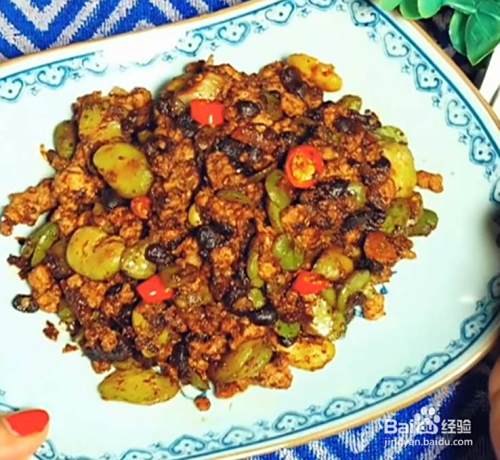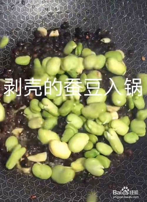 加入蒜片,蚕豆炒30秒。见下图