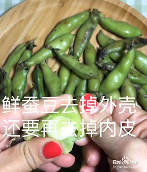 把新鲜的蚕豆剥掉外壳,再去掉内壳。见下图