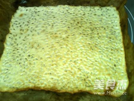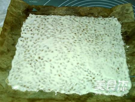 9将蛋糊倒在烤纸上,用刮刀抹平。