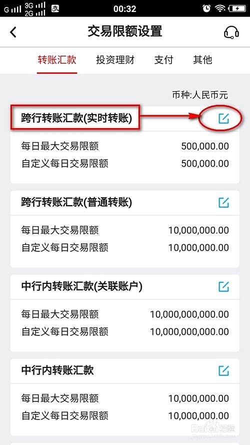 点击设置交易限额后,页面上方会弹出4个选项, 点击想要修改的限额类型后面编制图标。示例为:修改跨行转账汇款(实时转账)的限额。