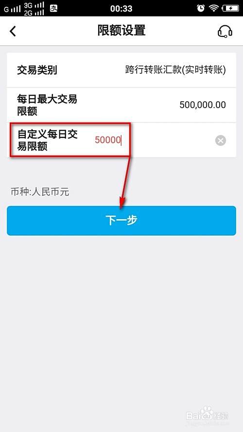 进入限额设置界面后,可以看到最大交易限额金额,在自定义每日交易限额后面框内输入想要修改的金额,最后点击下一步。