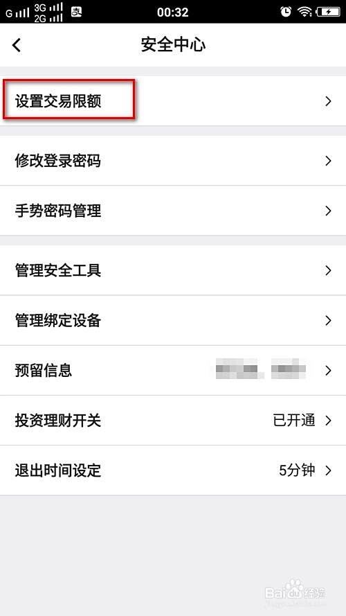 进入安全中心后,页面会弹出选项,点击设置交易限额。