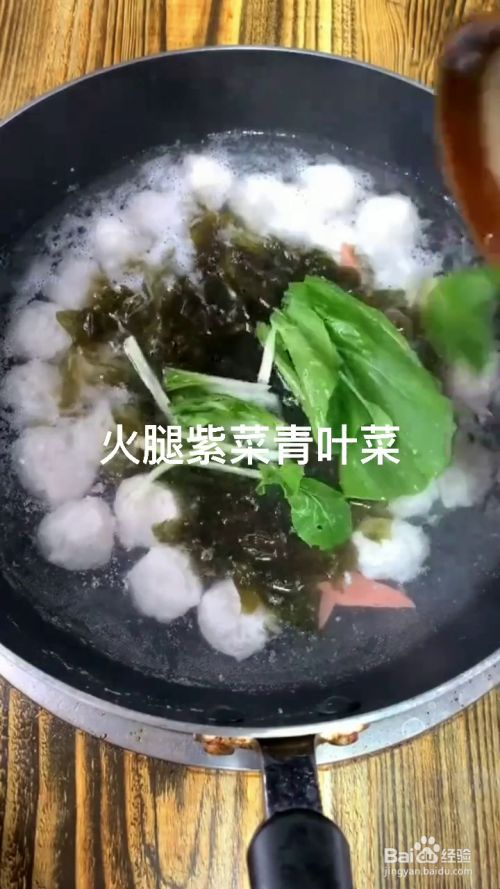 锅中烧水,烧至水温时将鱼肉攥成丸子放入,中小火煮至定型后开大火煮开,加入适量的火腿,紫菜,青叶菜