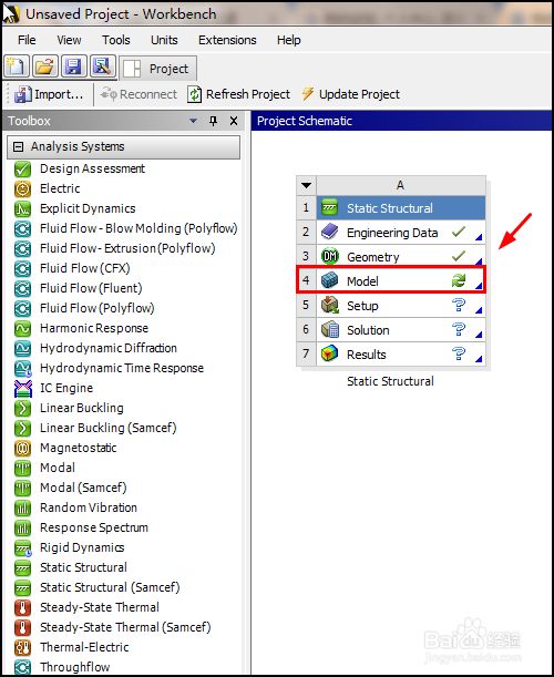 首先,选择你要分析的模块,笔者这里选择静力学分析模块,在工程数据和几何文件导入后,将对模型进行设置,双击model,如图所示