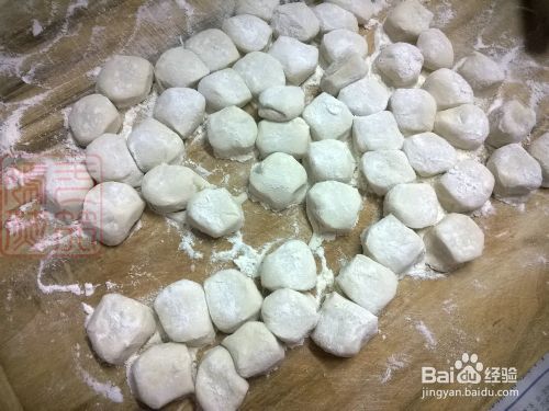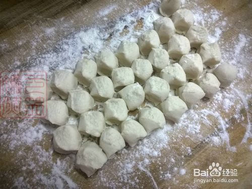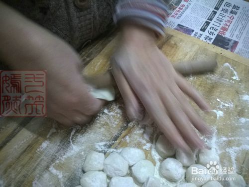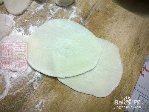 将醒好的面团,搓成长条,揪成小剂子,撒上干面粉,按扁,擀成饺子皮,