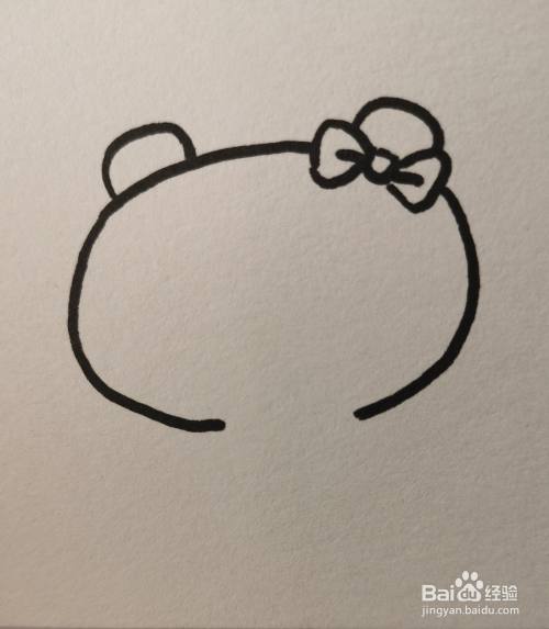 首先画出一个大的椭圆形的脑袋,在脑袋上方画出两个半圆的耳朵,给它加上一个可爱的蝴蝶结吧。