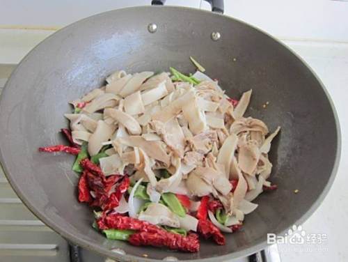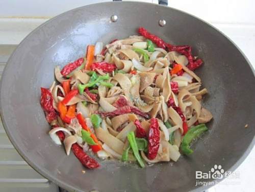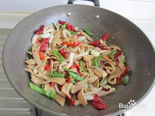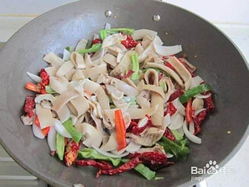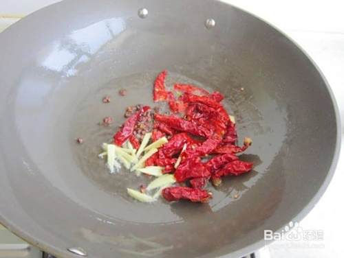 辣皮子用凉水泡泡洗净切段,姜切丝,大蒜切片,青红辣椒洗净切长宽条,皮牙子切长宽条