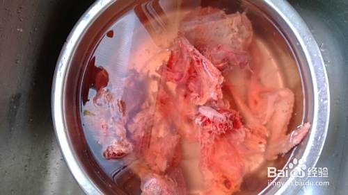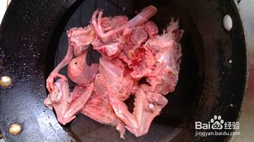 锅里烧热水,放入鸽子煮一会儿,把鸽子里的血水煮出来。