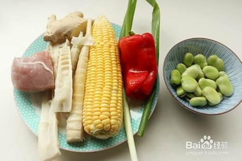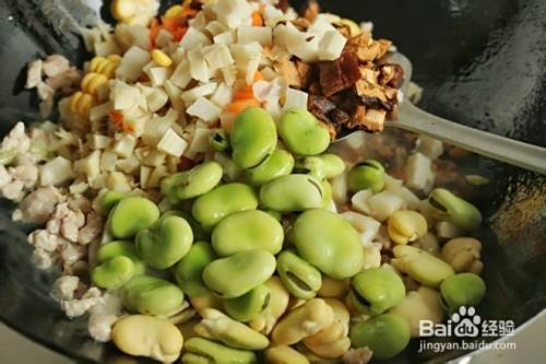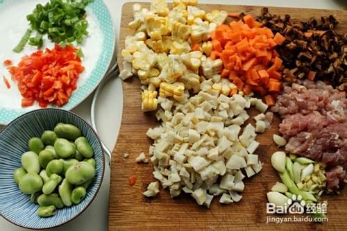 食材处理一下,蚕豆可以剥去外壳,吃的时候就很方便了,我这个蚕豆有一点点老,不过为了拍照好看就没剥去软壳,吃的时候需要吐出来。肉切末,红椒切碎,玉米分成小块,笋也切小丁,香菇切小丁。葱姜切碎。