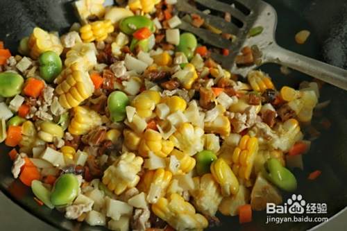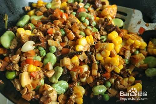 下入蔬菜翻炒,这一步除了红椒粒先不放,别的都放入锅里。