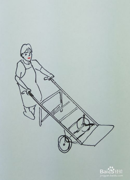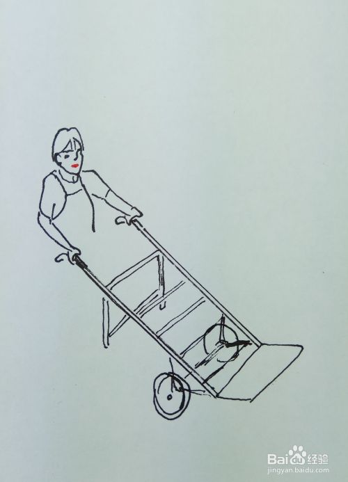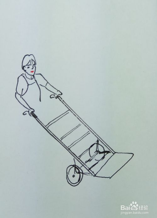用线条将这个运箱子的车的轮廓画完整,这个运箱工人正用手扶着这个车子呢。