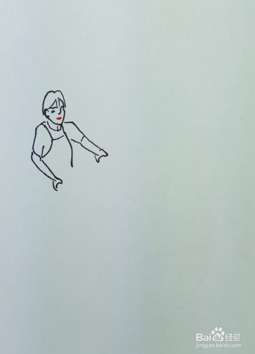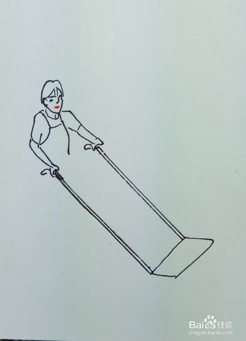 在白纸上用线条和曲线画出一个运箱工人的头部轮廓,并画出她的五官,头发和她的两个胳膊。