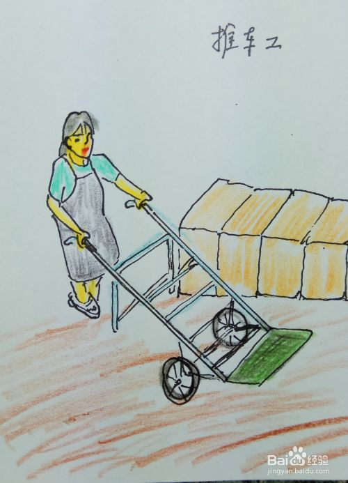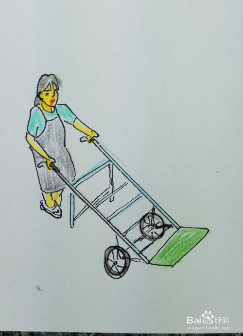 用水彩笔涂出这个工人的皮肤色彩,衣服色彩和围裙色彩,再涂出运箱车的色彩。