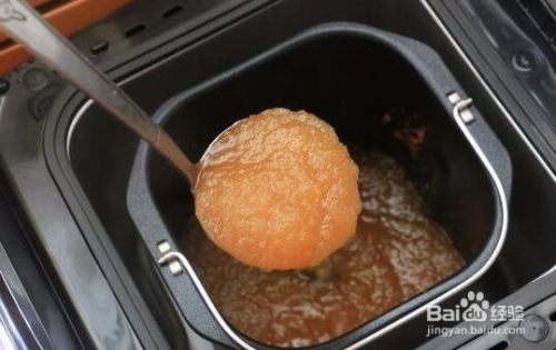 将苹果泥和砂糖一起倒入面包机桶里。选择“果酱”功能,启动面包机。