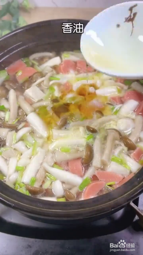 然后锅中放油,油热后葱姜爆香,再加入海鲜菇翻炒几下,加入适量的开水