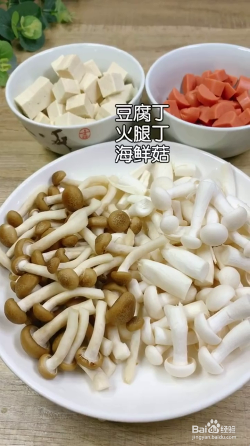 我们将火腿肠,豆腐切丁,然后将海鲜菇去根,清洗干净