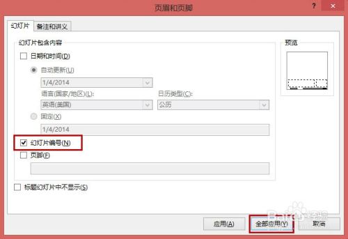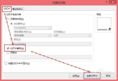 这时候打开“页眉和页脚”对话框,在“幻灯片”选项卡中,选中“幻灯片编号”前的复选框,然后单击“全部应用”即可让每一张幻灯片都显示编号。