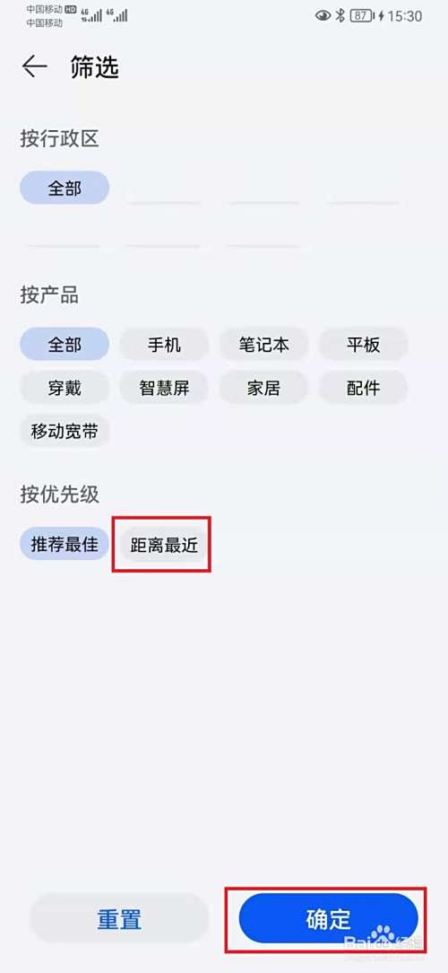 在打开的筛选页面,选择【距离最近】条件后,点击【确定】,即可查询距离最近的华为手机服务店位置。