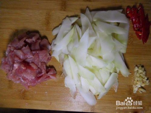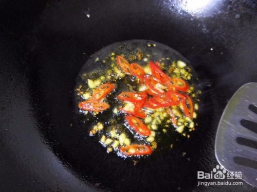 3.热油,爆香蒜头,倒入红辣椒丝翻炒;
