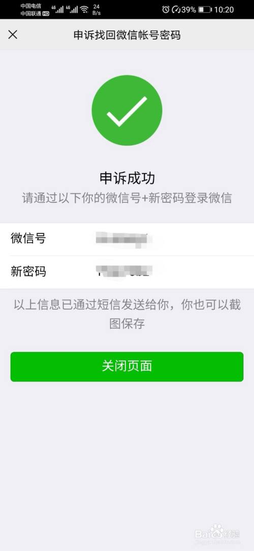 7、填写之前的实名信息,确认后直接显示申诉成功界面,截图保存微信账号和密码。
