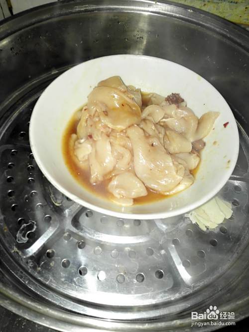 将调好味的鸡脯肉放在蒸隔上;