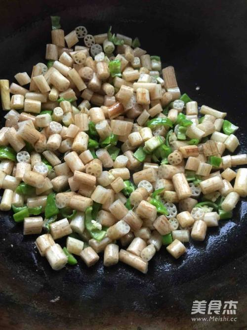 锅底放油烧热下藕尖炒30秒后再下辣椒丁炒2分钟。再放盐炒匀即可