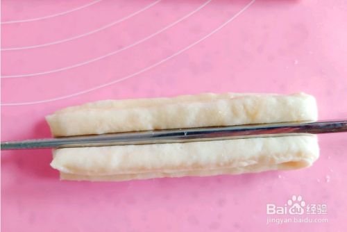 把两条面叠在一起用筷子压一下,再把两边捏紧,这样油条的形状大概就出来了